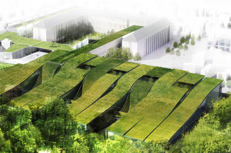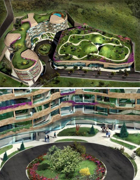 這個名為“One & Ortakoy”的多功能建筑群位于土耳其的伊斯坦布爾。它擁有彎曲的有機形態以及被綠草和鮮花覆蓋的起伏屋頂,與所在的美麗山區融為一體。這個建筑群位于奧爾塔科伊附近地區,現正在建造之中。它由兩座建筑構成,正面使用天然石頭打造。其中一座是住宅建筑,另一座則是商用建筑。    4.法國綠屋頂中學