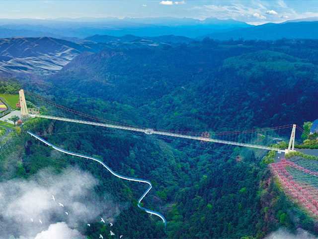 新晉網紅打卡玻璃棧道橋,橫跨大峽谷,主塔縱向采用人子字形,以滿足大跨度人行吊橋的需要