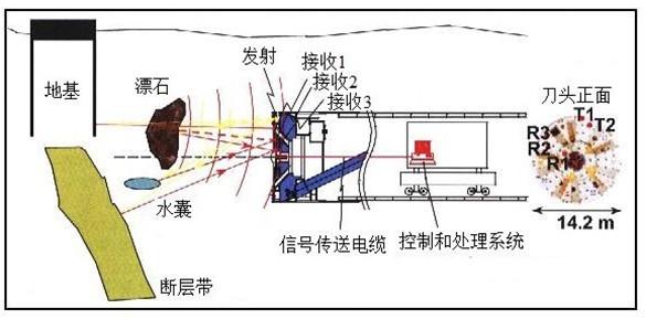 在盾構機或TBM上安裝超前地質預報設備,一直是機械開挖的目標和方向,但目前的盾構機和TBM基本上還沒有這方面的設備。日本一些學者,做過一些SSP(Sonic Soft Ground Probing)聲波前方預報的試驗工作(見下圖),但目前仍沒有更深入的研究成果和更成熟的經驗。