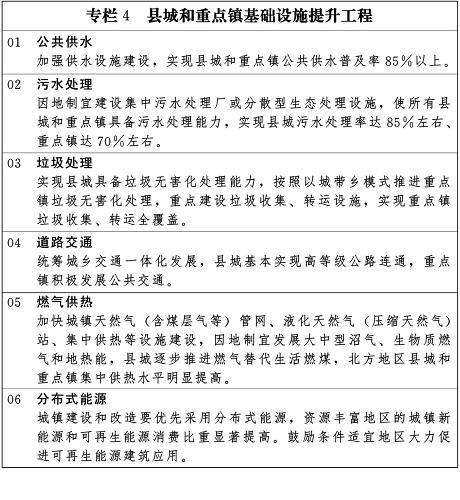 加快農村飲水安全建設,因地制宜采取集中供水、分散供水和城鎮供水管網向農村延伸的方式解決農村人口飲用水安全問題。繼續實施農村電網改造升級工程,提高農村供電能力和可性,實現城鄉用電同網同價。加強以太陽能、生物沼氣為重點的清潔能源建設及相關技術服務。基本完成農村危房改造。完善農村公路網絡,實現行政村通班車。加強鄉村旅游服務網絡、農村郵政設施和寬帶網絡建設,改善農村消防安全條件。繼續實施新農村現代流通網絡工程,培育面向農村的大型流通企業,增加農村商品零售、餐飲及其他生活服務網點。深入開展農村環境綜合整治,實施鄉村清潔工程,開展村莊整治,推進農村垃圾、污水處理和土壤環境整治,加快農村河道、水環境整治,嚴禁城市和工業污染向農村擴散。