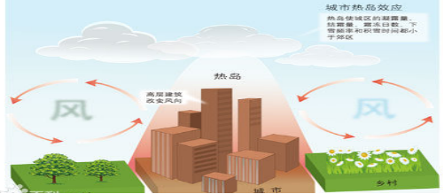 城市人口集中,工業(yè)發(fā)達,交通擁塞,大氣污染嚴重,城市建筑大多為石材和混凝土,其熱容量低,熱傳導率高,加上建筑物本身對風的阻擋或減弱作用,致城市年平均氣溫比郊區(qū)偏高(可高2℃以上),在溫度的空間分布上, 城市猶如一個溫暖的島嶼。