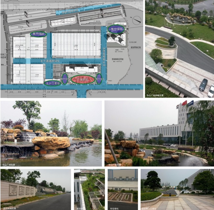 面:重點打造綜合樓入口中心廣場的景觀,高達一萬多平米的集中園林綠化為物流園區(qū)提供了清新的綠肺,作為園區(qū)核心風(fēng)貌景觀區(qū)與綜合樓相映成趣,提升了園區(qū)的整體景觀品質(zhì),也為園區(qū)物流人員提供了一個輕松交流、親近自然的休閑場所。除了中心廣場,我們還充分利用綜合樓的南北兩側(cè)裙房做了大面積的屋頂綠化,為五樓的辦公人員創(chuàng)建了舒心宜人的空中花園,兼具環(huán)保功能與景觀效益。在多層次的立體綠化園林襯托下,整個嘉寶物流基地顯得流光溢彩,生意盎然(圖17)。