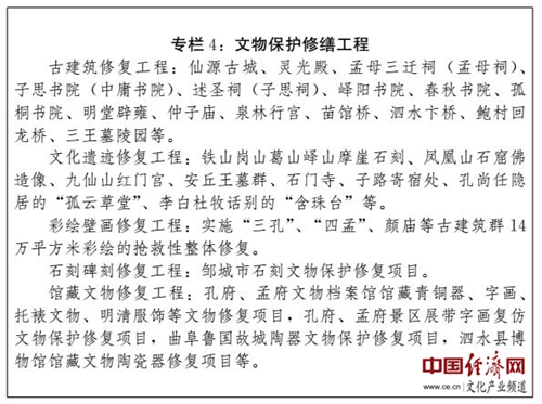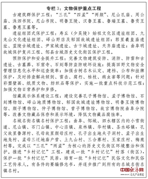 (三)建設國家記憶工程先行區。充分發揮擁有史前文化完整序列和脈絡清晰文化譜系的優勢,加強文化遺產及大遺址保護,做好古建筑、古遺址的文物本體維修,實施搶救性保護、預防性保護和科學修復工程;加強文物資源系統梳理、典籍文獻搜集整理編纂保護,建設儒家文化資源數據庫;擴大文物資源對公眾的開放度,推動博物館文創產品開發,建設全國文化遺產保護利用示范區,在實施國家記憶工程進程中走在前列。