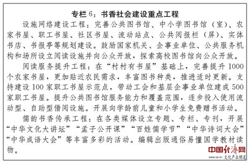(二)實施書香社會建設行動計劃。遵循公益性、基本性、均等性、便利性原則,大力促進全民閱讀,打造儒韻書香氛圍,顯著提高國民素質和社會文明程度。開展經常性全民閱讀活動,在孔子誕辰日、世界讀書日及重要節慶日舉辦讀書講座、集體閱讀、演講比賽等活動,培育和鞏固各類書香品牌,使讀圣賢之書深入生活、成為常態。支持依法成立讀書會、品讀論壇、社區書社等各類組織,發揮文化名人、領導干部、教師等示范帶動作用,定期推薦面向不同讀者群體的優秀出版物,引導群眾多讀書、品經典、賞名著。完善覆蓋城鄉、實用便利、服務高效的全民閱讀設施網絡,充分考慮特殊群體需求,保證閱讀資源定期流轉、補充和更新。加快“儒韻書香”數字化閱讀平臺建設,提供正版數字圖書免費在線閱讀,促進閱讀新技術、新載體、新設施的開發應用。加強中小學書香校園文化建設,持續開展“經典誦讀”活動,從娃娃抓起培養閱讀興趣,用好習慣為書香社會奠定基石。到2020年,力爭年人均紙質圖書和電子書合計閱讀量達到15本,顯著高于全國平均水平。