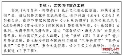 (四)打造儒藝創意文化產業基地。以曲阜新區國家級文化產業示范區和孟子湖新區為重點,突出創意文化環節的開發和拓展,推動創意文化產業與其他產業的相互滲透和融合發展,建設具有儒家特色的創意文化產業集群。依托文化文物單位館藏文化資源,充分采用數字化、信息化技術,研發推出工藝精良、制作精美的文物創意產品、旅游紀念品和衍生創意產品,促進文化創意產品創新發展。大力發展以儒家文化品牌為主導的動漫產業,積極加強基于虛擬現實技術的原創動漫游戲產品創作,構建高端動漫、網絡游戲產業發展體系。積極推動與儒家文化品牌動漫有關的圖書、報刊、音像制品的發行出版,引導企業開發生產衍生產品。積極采用全景環繞、虛擬現實等技術,創作一批影視精品、舞臺劇、音樂劇,打造高品質旅游實景演藝產品,再現孔孟形象,反映儒學思想對人類文明的貢獻、春秋戰國時代的社會變革;積極加強與中央和省市各級電視臺、影視制作單位和網絡媒體的戰略合作,爭取建設影視基地。