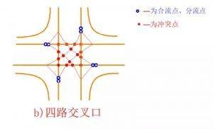 四路十字形交叉口,16個(gè)沖突點(diǎn)、8個(gè)合流點(diǎn)、分流點(diǎn)。