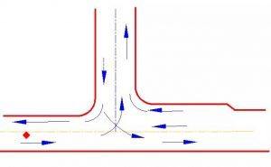 主要公路為二級(jí)公路的T形交叉,當(dāng)直行交通量不大,而與次要公路間的轉(zhuǎn)彎交通量占相當(dāng)比例。