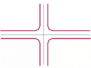 當(dāng)主要公路的直行、轉(zhuǎn)彎交通量較大時(shí),則采用在主要公路和次要公路上均設(shè)分隔島的渠化T形交叉。