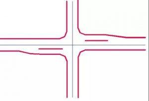 右轉(zhuǎn)車(chē)道:在進(jìn)道口右側(cè)或同時(shí)在出道口右側(cè)擴(kuò)寬