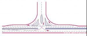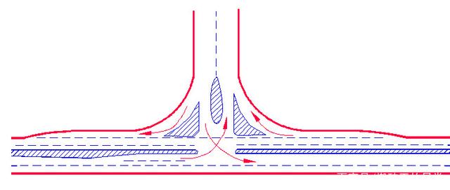 主要公路與次要公路的T形交叉,當(dāng)轉(zhuǎn)彎交通量較大而會(huì)導(dǎo)致直行車(chē)輛的過(guò)分減速時(shí),應(yīng)采用加寬式T形交叉左轉(zhuǎn)彎交通量較大者,可采用該型式。