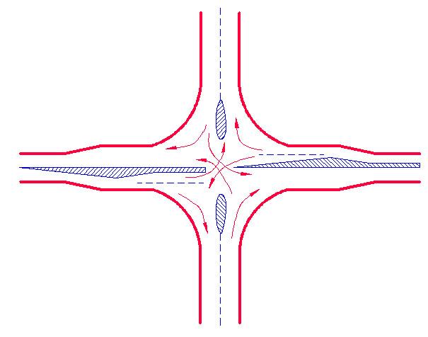 適當(dāng)布置交通島限制行車(chē)路線,使車(chē)流按一定組織方式通過(guò)交叉口,把沖突限制在一定范圍內(nèi);