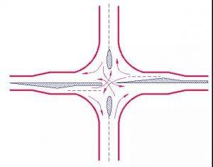 采用環(huán)形交叉(俗稱轉(zhuǎn)盤(pán)),使進(jìn)入交叉口后的車(chē)輛按逆時(shí)針?lè)较颦h(huán)繞中心島作單向行駛至駛出口,均以同一方向循序前進(jìn),消滅交叉口的沖突點(diǎn)。