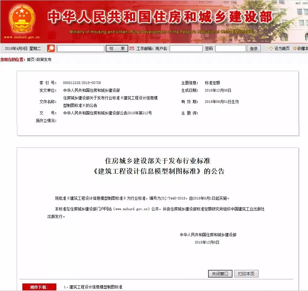 昨日,住建部官網發布了“住房城鄉建設部關于發布行業標準《建筑工程設計信息模型制圖標準》的公告”,批準《建筑工程設計信息模型制圖標準》為行業標準,編號為JGJ/T448-2018,自2019年6月1日起實施。