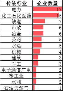 共涉及 14 個細分行業:電力、電子通信廣電、公路、核工業、化工石化醫藥、機械、建筑、軍工、石油天然氣、市政、水利、水運、鐵道、冶金。其中,電力行業企業最多,有 17 家;其次為石油化工醫藥行業,有 15 家企業,鐵道行業居第三,有 7 家企業。