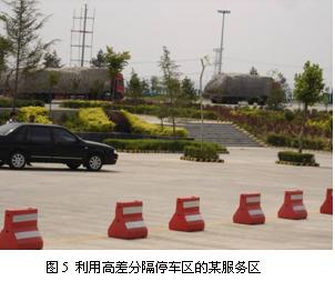 規(guī)劃應考慮按照不同車輛的停車要求將停車場進行合理劃分,較合理的劃分應該是:客車區(qū)、小轎車區(qū)、貨車及超長車區(qū)及特種車區(qū)。根據(jù)這四類不同車輛的不同要求,規(guī)劃停車區(qū)和牽出道,嚴禁客貨混停,防止超長車倒車停放。各區(qū)之間用綠島隔離,達到美化遮陽的效果;或者利用地形高差自然分隔,也可以防止不同類型車輛混停,這在我們調(diào)研中就有很好的一例(如圖5所示)。停車場可盡量做大,隔離島要少而小,避免影響停車和交通,要盡可能留有發(fā)展余地,所需土地可一次征用,分期擴建,初期可暫以綠地替代。