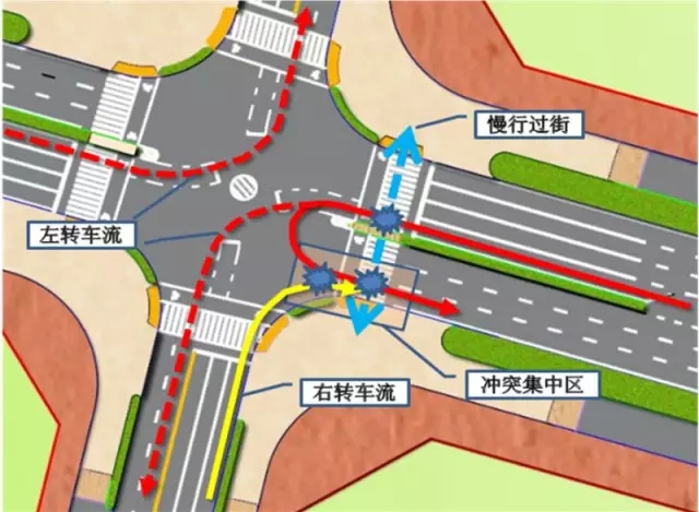 特征分析:只能在左轉(zhuǎn)相位允許時(shí)使用,占用交叉口展寬資源,易與行人過(guò)街及對(duì)向右轉(zhuǎn)車(chē)形成干擾。
