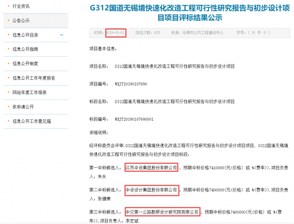 今年3月1日,無錫市城市重點(diǎn)項目管理中心發(fā)布的《G312國道無錫境快速化改造工程可行性研究報告與初步設(shè)計項目項目評標(biāo)結(jié)果公示》顯示,該項目標(biāo)段的第一中標(biāo)候選人為中設(shè)股份,第二中標(biāo)候選人為中設(shè)集團(tuán),第三中標(biāo)候選人為中交第一公路勘察設(shè)計研究院有限公司。