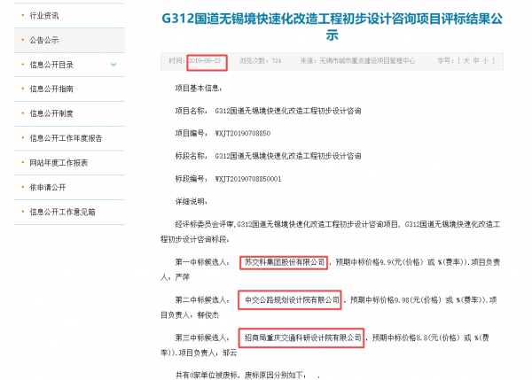 此外,無錫市城市重點(diǎn)項目管理中心于今年8月23日發(fā)布的《G312國道無錫境快速化改造工程初步設(shè)計咨詢項目評標(biāo)結(jié)果公示》顯示,該項目標(biāo)段的第一中標(biāo)候選人為蘇交科、第二中標(biāo)候選人為中交公路規(guī)劃設(shè)計院有限公司、第三中標(biāo)候選人為招商局重慶科研設(shè)計研究院有限公司。