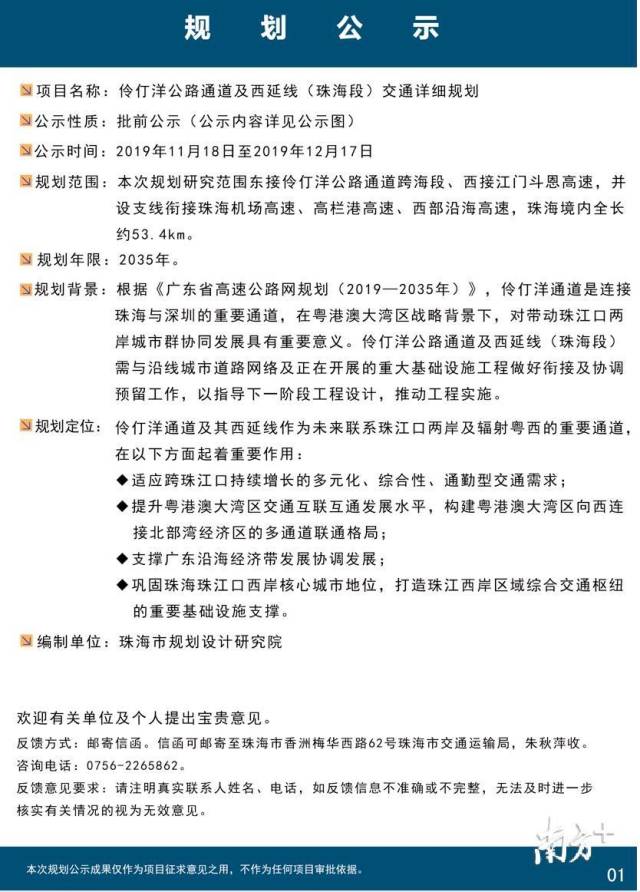 18日,珠海市交通運輸局官網公布關于《伶仃洋公路通道及西延線(珠海段)交通詳細規劃》(下稱《規劃》)公開征求意見的公告,向社會征求意見意見和建議。