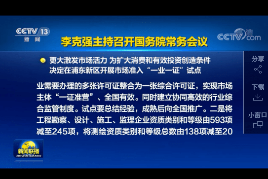 國務(wù)院總理李克強(qiáng)11月11日主持召開國務(wù)院常務(wù)會(huì)議,聽取國務(wù)院第七次大督查情況匯報(bào),確保政策落實(shí),更好發(fā)揮促進(jìn)經(jīng)濟(jì)穩(wěn)定恢復(fù)的重要作用;決定在浦東新區(qū)開展市場準(zhǔn)入“一業(yè)一證”試點(diǎn),在全國大幅壓減建設(shè)工程企業(yè)和測繪資質(zhì)并加強(qiáng)監(jiān)管,更大激發(fā)市場活力,為擴(kuò)大消費(fèi)和有效投資創(chuàng)造條件。