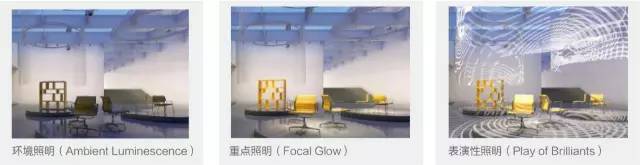 照明的三種基本功能分別是環(huán)境照明(Ambient Luminescence)、重點照明(Focal Glow)和表演性照明(Play of Brilliants)。