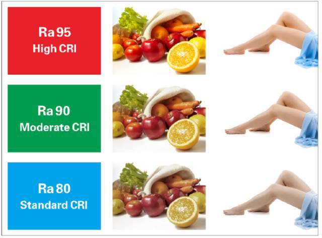 是指物體被光源發(fā)出的光照明時色彩被還原的真實程度。白熾燈的顯色指數(shù)為100,也就是說它對于色彩的還原性可以做到100%。現(xiàn)在市面上對于LED光源的應用越來越普及,住宅照明產品光源的顯色指數(shù)都應該要大于80,優(yōu)質LED光源的顯色指數(shù)能達到90以上甚至95,但是有一大部分的劣質產品其光源的顯色指數(shù)都不到70,所以用戶在選擇的時候一定要引起注意。下面關于顯色指數(shù)的對比圖可以有一個相對直觀的感受: