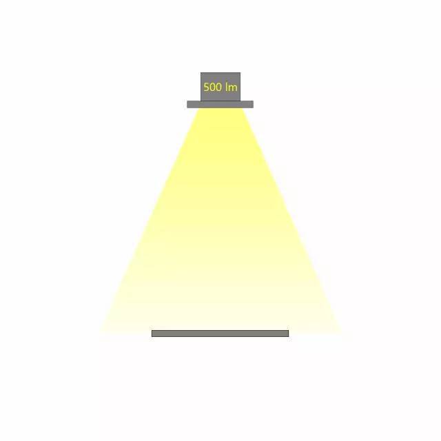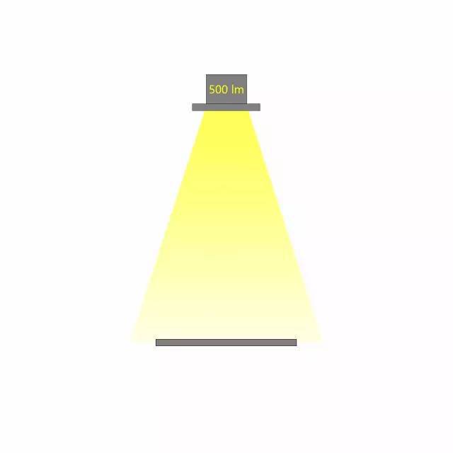 相同光通量的燈具,不同的配光角度,在相同的距離照射到同一個平面,所產生的照度是不同的。配光角度越大,相同距離的照度越小。如下圖,燈具的光通量為500lx,當配光角度不同時,相應的照度也會不同。