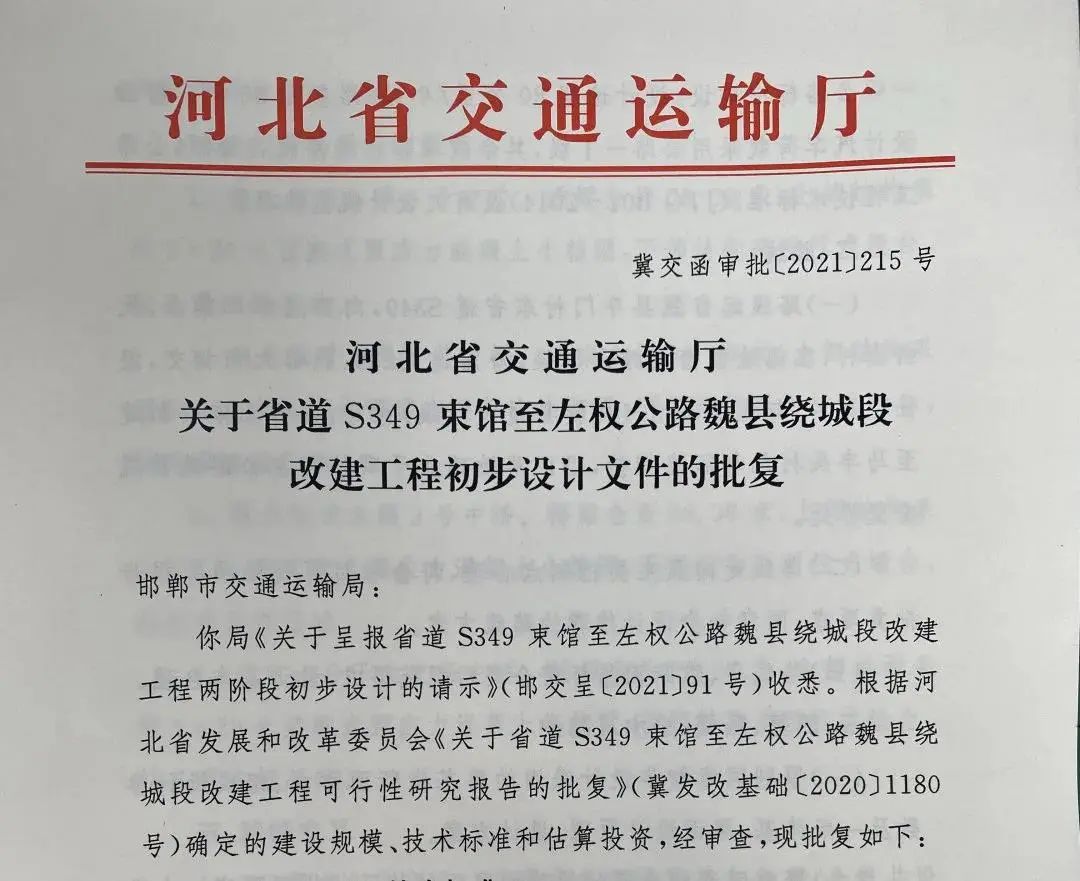 邯鄲S349束左公路魏縣段(新南環(huán))初步設(shè)計獲省批