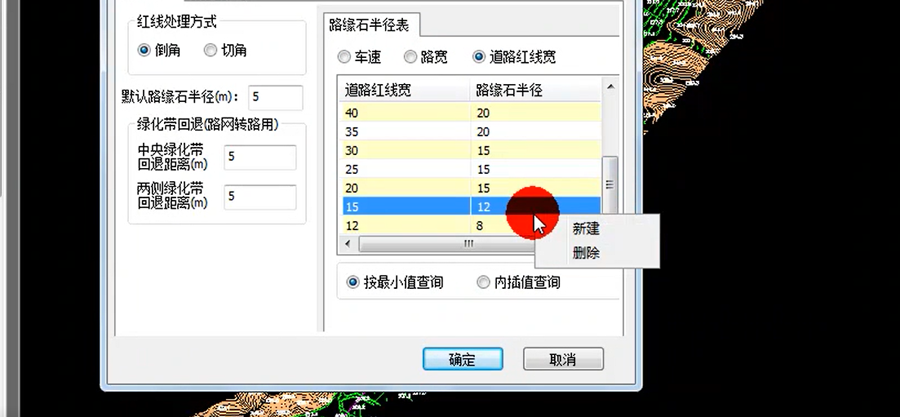 3)道路紅線寬是指針對(duì)不同的道路紅線寬對(duì)于不同的路緣石半徑,我們可以進(jìn)行“新建”、“刪除”。