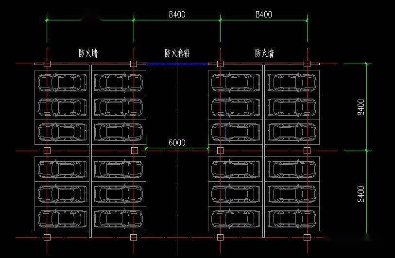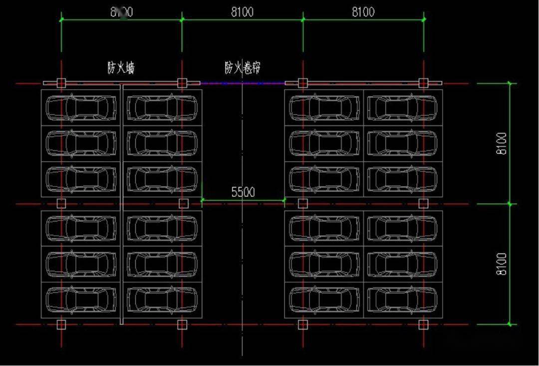 柱網:柱網按7800~8400x(2a+b)/2布置。以橫向停3輛車為例,垂直行車道方向柱(2a+b)/2,其中:a為停車位深度,b為行車道寬度。