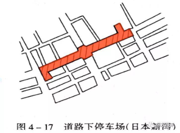 曲線形坡道占地面積小,適用于狹窄地段,視線效果差,進出不太方便,圖4-36(d)、(e)