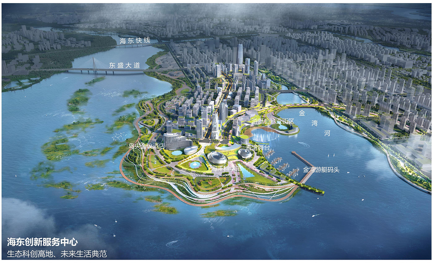 打造海東新區的生態創新高地,樹立一灣兩岸創新生活典范。延續歷版規劃中的生態內灣,同時將生態岸線延伸至北岸,形成龍王灣環島濕地公園。濱海一線實施低強度開發,內陸開發強度梯度式提升,將商娛、科普功能融入濱海濕地公園,提升濱海活力。