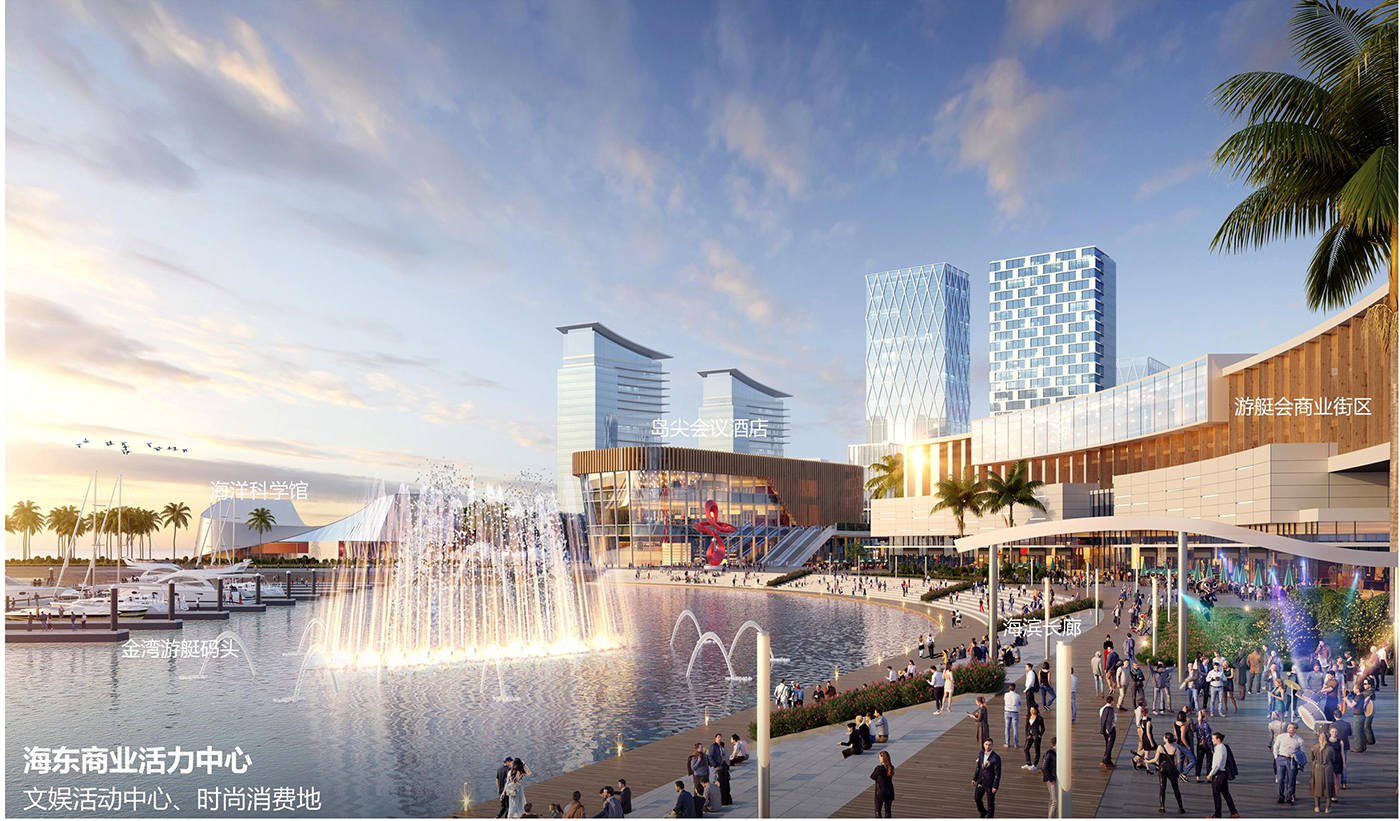 設計要點:重點貫通濱海空間,提升改造原漁港公園、中澳友誼花園,新增軍民公園、體育公園、海軍修船廠公園三大主題公園46公頃,打造一灣兩岸最活力、最繽紛的濱海公共空間。設計三條通海廊使濱海活力向內城滲透,四組團朝濱海扇形展開,形成沿海岸線步移景異的城市形象。