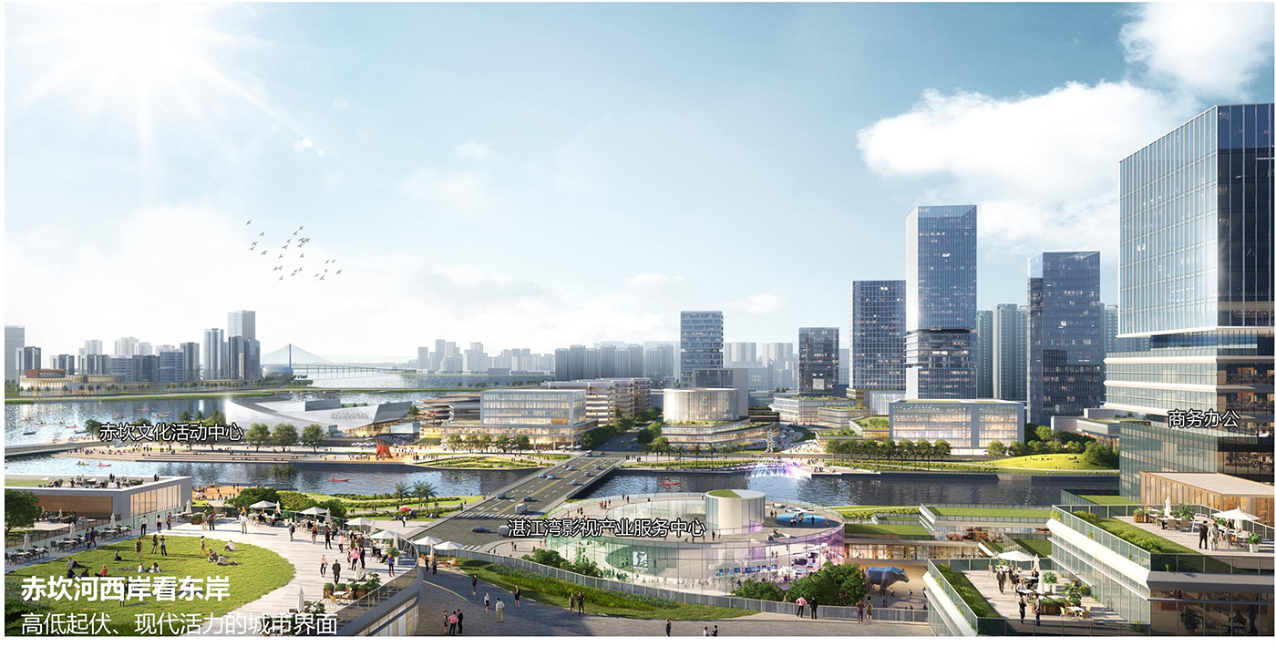 設計要點:重點打造赤坎河、文沖河濱水地區,構建T形水軸,完善片區生態網絡。重點塑造赤坎河口公共空間與城市界面,將赤坎河口塑造為片區的公共中心,一灣兩岸的標志性節點。