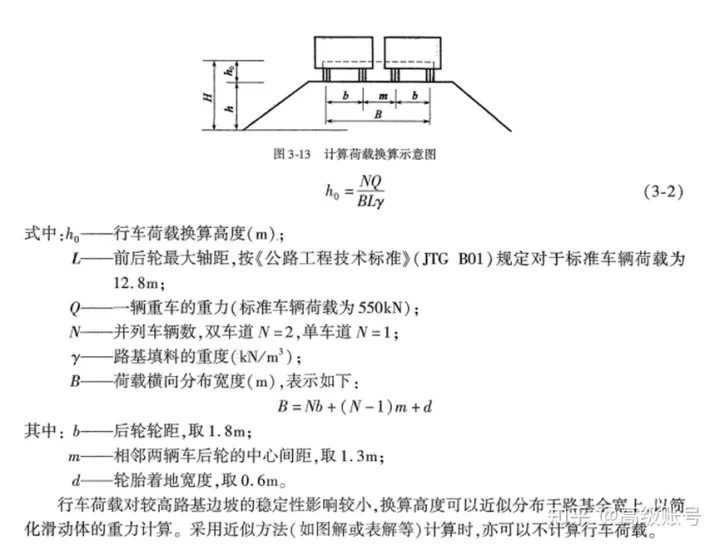在《公路路基設(shè)計規(guī)范》(JTG D30-2015)中沒有發(fā)現(xiàn)對邊坡穩(wěn)定計算時行車荷載如何考慮的條文,但是在《路基路面工程》(黃曉明版)和《公路軟土地基路堤設(shè)計與施工技術(shù)細則》(JTG/T D31-02-2013)中有相關(guān)表述。《公路軟土地基路堤設(shè)計與施工技術(shù)細則》4.1.4-4.1.6條的規(guī)定如下,即將行車荷載換算成土柱高度,可按車輛荷載均布于車輛投影面積上換算得出。