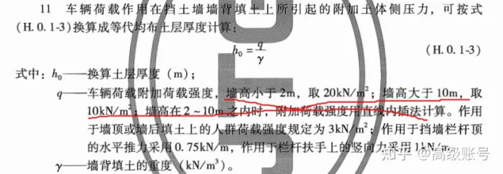 對于擋土墻的結(jié)構(gòu)設(shè)計和驗算,在《公路路基設(shè)計規(guī)范》(JTG D30-2015)的附錄H里對行車荷載如何考慮是有規(guī)定的,H.0.1的11條,核心思路也是將車輛荷載換算為對應(yīng)土柱高度,但是相較穩(wěn)定計算則考慮的更為簡單,它的車輛荷載附加荷載強度值是給定的,10~20kPa,按照規(guī)定取就行了。