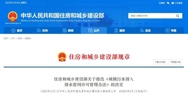 住房和城鄉建設部發布《關于修改<城鎮污水排入排水管網許可管理辦法>的決定》,對《城鎮污水排入排水管網許可管理辦法》(住房和城鄉建設部令第21號)作出修改,進一步對排水戶分級分類管理、優化審批服務、監督管理及法律責任作了明確規定,將于2023年2月1日起施行。以下為“決定”全文以及“管理辦法”全文。