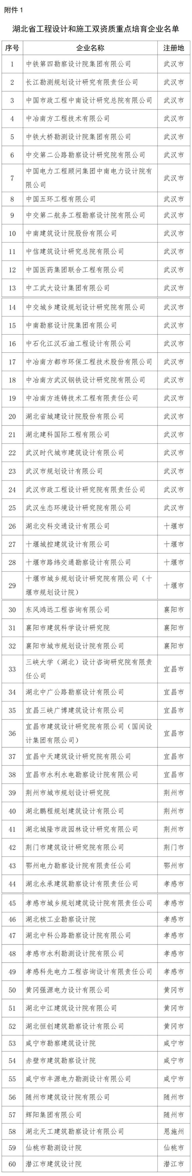 根據(jù)《關(guān)于加強工程勘察設(shè)計重點企業(yè)培育的通知》及有關(guān)文件規(guī)定,省住建廳對擬列入重點培育企業(yè)名單的企業(yè)進行了公示,公示期內(nèi),無任何單位和個人提出異議。現(xiàn)將中鐵第四勘察設(shè)計院集團有限公司、長江勘測規(guī)劃設(shè)計研究有限公司、中國市政工程中南設(shè)計研究總院有限公司等60家重點培育企業(yè)予以公布(附件1)。