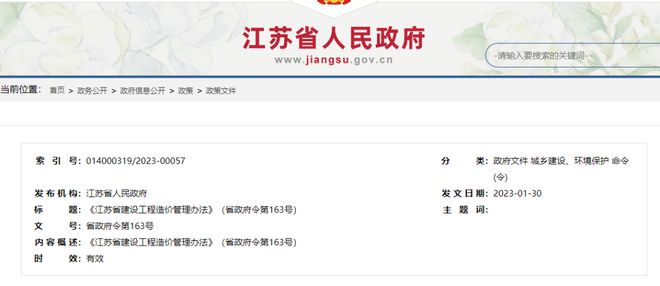 江蘇省人民政府令第 163 號《江蘇省建設工程造價管理辦法》已于2023年1月27日經省人民政府第1次常務會議討論通過,現予公布,自2023年4月1日起施行