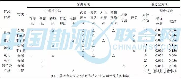 1) 各種管線類型最適宜探測方法的精度均能達到規范。