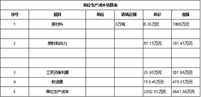 1)單位生產(chǎn)成本的估算,序號項(xiàng)目規(guī)格單位消耗定額單位金額