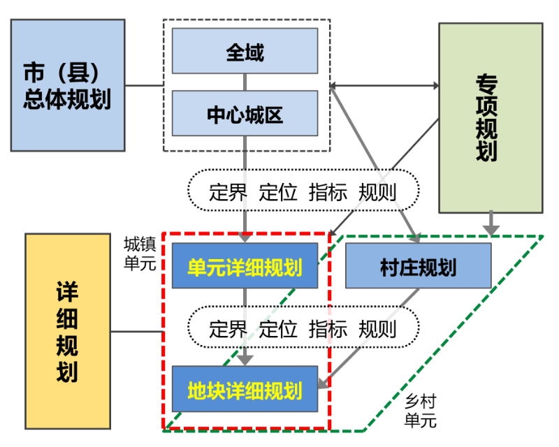 (一)重構(gòu)“中心城區(qū)—單元—地塊”傳導層級。針對原控規(guī)承接傳導體系不健全情況,依據(jù)國土空間總體規(guī)劃,立足城鎮(zhèn)開發(fā)邊界和中心城區(qū)關(guān)系,重構(gòu)“全域空間—中心城區(qū)—單元—地塊”多層級、全覆蓋的傳導體系。明確單元作為市、縣國土空間總體規(guī)劃向詳細規(guī)劃傳導規(guī)劃內(nèi)容和要求的空間載體,是詳細規(guī)劃編制、管理、實施和監(jiān)督的基本單位,在國土空間總體規(guī)劃階段劃定。地塊則是詳細規(guī)劃管理和項目實施單位。