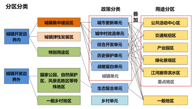 (一)搭建用途分區(qū)疊加分類政策多場景。立足國土空間全域全要素規(guī)劃管控要求,協(xié)調(diào)城鎮(zhèn)開發(fā)邊界內(nèi)外關(guān)系,劃分一般用途區(qū)和重點用途區(qū),其中重點區(qū)包括公共活動中心區(qū)、交通樞紐區(qū)和江河廊帶濱水區(qū)等。在用途分區(qū)基礎(chǔ)上,疊加各類政策,明確城市更新、城中村改造、綜合開發(fā)、歷史保護、生態(tài)復(fù)合和戰(zhàn)略留白等類型單元,進行分區(qū)分類指引,實現(xiàn)土地利用全生命周期、全利用方式的管控,保障相關(guān)政策得以落地。