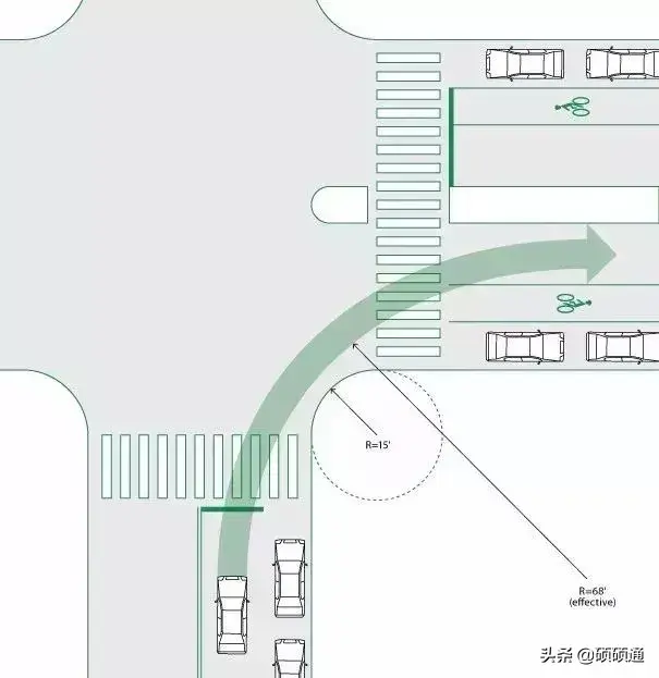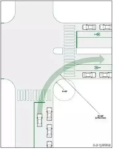 《美國城市街道設(shè)計手冊》規(guī)定,常規(guī)城市道路交叉口轉(zhuǎn)彎半徑是3~4.5米(10~15英尺),且在很多城市,轉(zhuǎn)彎半徑用了非常小的0.6米(2英尺),大于4.5米的轉(zhuǎn)彎半徑只會在極特殊情況下才會采用。