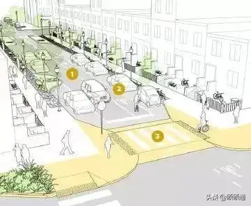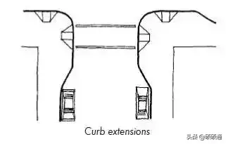 此外,在居住區(qū)或是有路側(cè)停車的城市支路,可將交叉口進行縮窄設(shè)計,以減小行人過街距離,進一步降低車輛轉(zhuǎn)彎速度、保障行人安全。