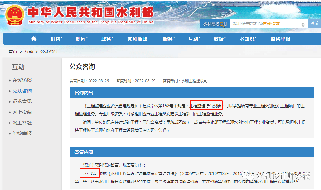 水利部權(quán)威回復:住建部頒發(fā)的綜合監(jiān)理、水利監(jiān)理資質(zhì)不得從事水利工程監(jiān)理!