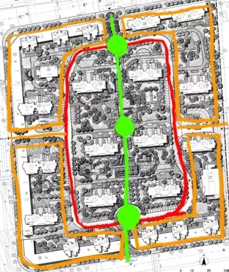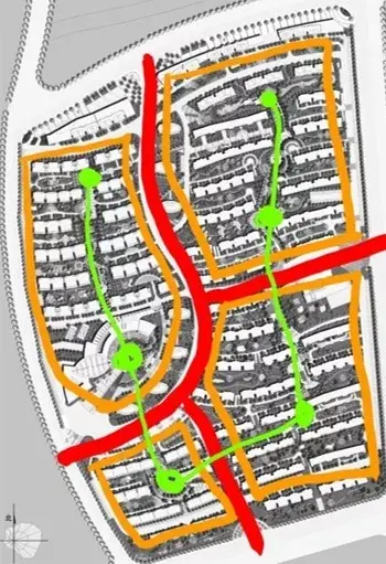 強調南北主線, 通過錯開的方式獲得變化,內部加入環形路聯系四個組團中心,適合低密度產品。