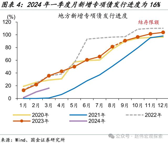 不過,今年以來專項債發行進度明顯慢于去年。公開數據顯示,2024年一季度,地方新增專項債共發行約6341億元,同比下降約53%,已發行額度占全年新增專項債額度比重(發債進度)僅16%,遠低于去年同期的35%。而4月份以來專項債發行也并未出現明顯提速跡象。