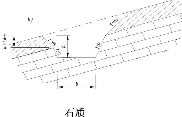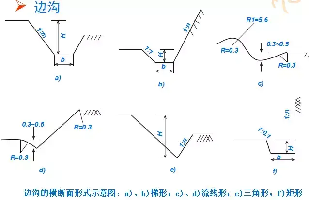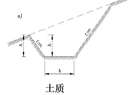橫斷面:一般為梯形,溝的邊坡坡度,因巖土條件而定,一般采用1:1.0~1:1.5。溝底寬度b不小于0.5m,溝深h按設(shè)計流量而定,亦不應小于0.5m。