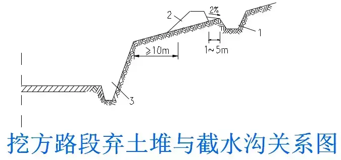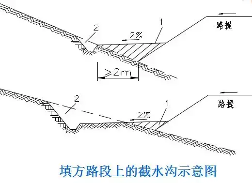 (1)橫向位置:截水溝一般布置在路塹邊坡或陡坡路堤上側(cè),垂直于山坡水流方向或基本與等高線平行。視降雨量,可以不設(shè)或設(shè)計多道。